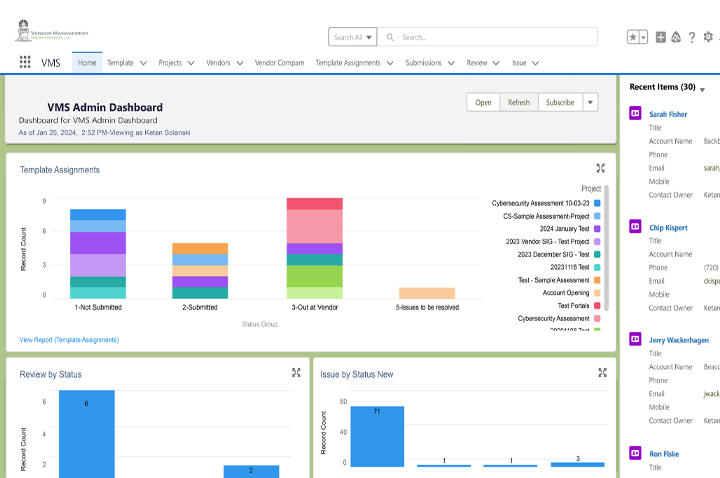 Access to reports, reviews, open items, response progress and vendor answer and scoring comparison.